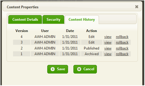 Click on ‘rollback’ next to the version you wish to restore, and then click ‘Save’. The popup will go away and the content will now be checked out but looking like the version selected. If you were to look at the Content History now, it would look like this: